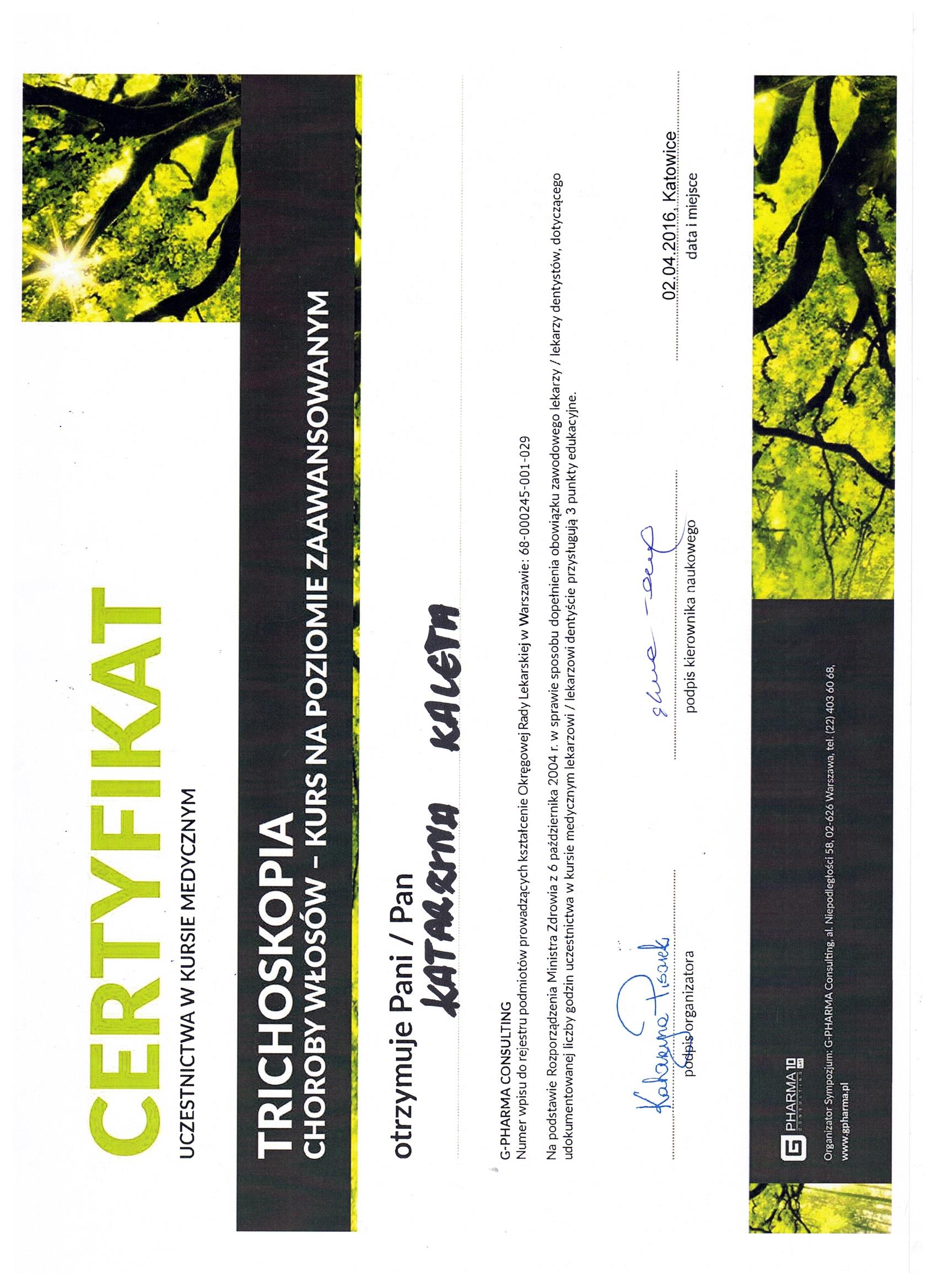 Absolwentka Wydziału Lekarskiego Collegium Medicum w Krakowie. W czasie studiów odbyła dwukrotnie staże zagraniczne (Tor Vergata University of Rome; The Carl Gustav Carus Hospital in Dresden). W trakcie szkolenia specjalizacyjnego brała udział w kursach i stażach w kraju i za granicą; m.in. International Short Course on Dermoscopy w Gratz, a także w 3 miesięcznym stażu w Oddziale Dermatologicznym w Niemczech (Dessau Medical Center). W październiku 2020 otrzymała tytuł specjalisty z zakresu dermatologii i wenerologii.